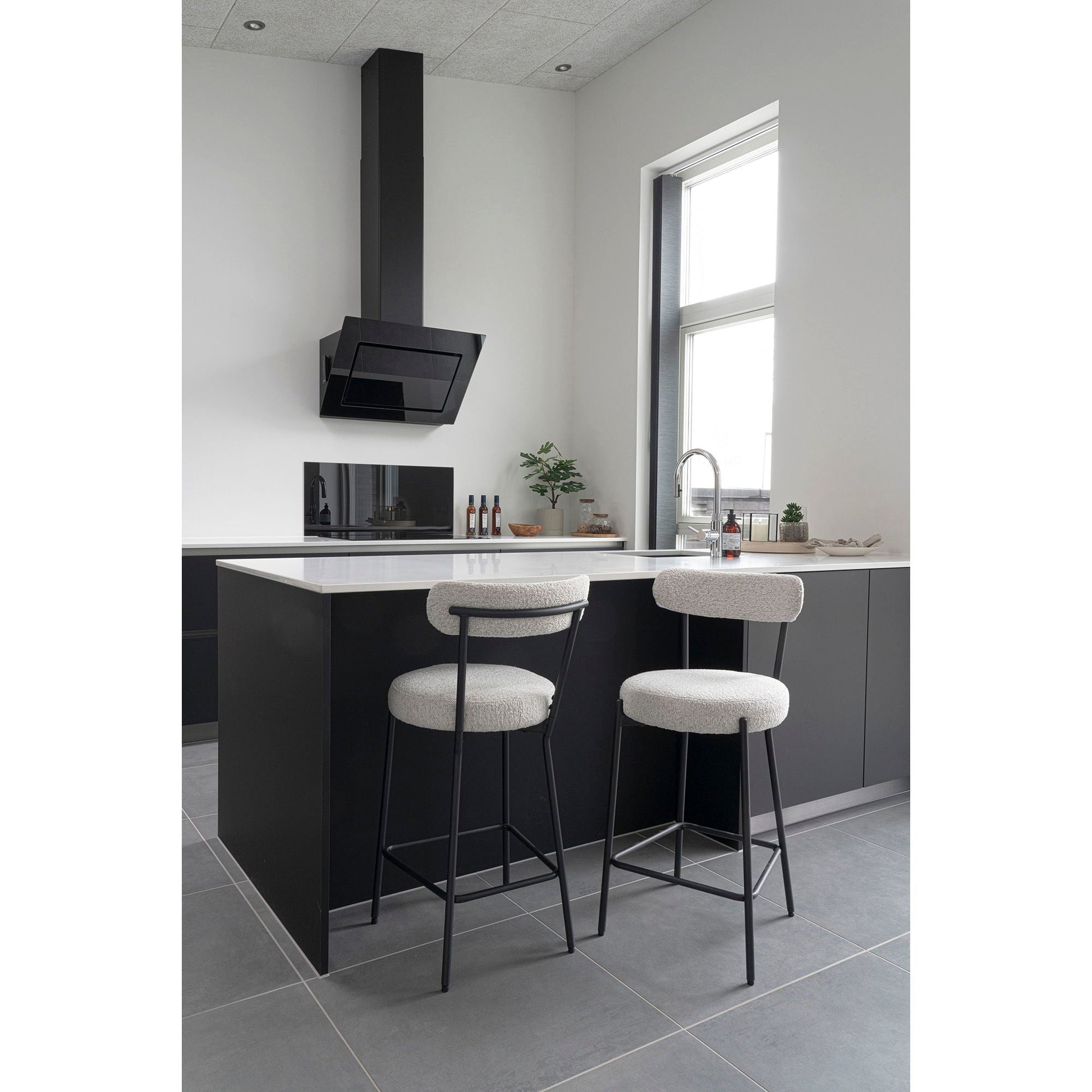 Chaise de comptoir, bouclé, blanc, pieds noirs